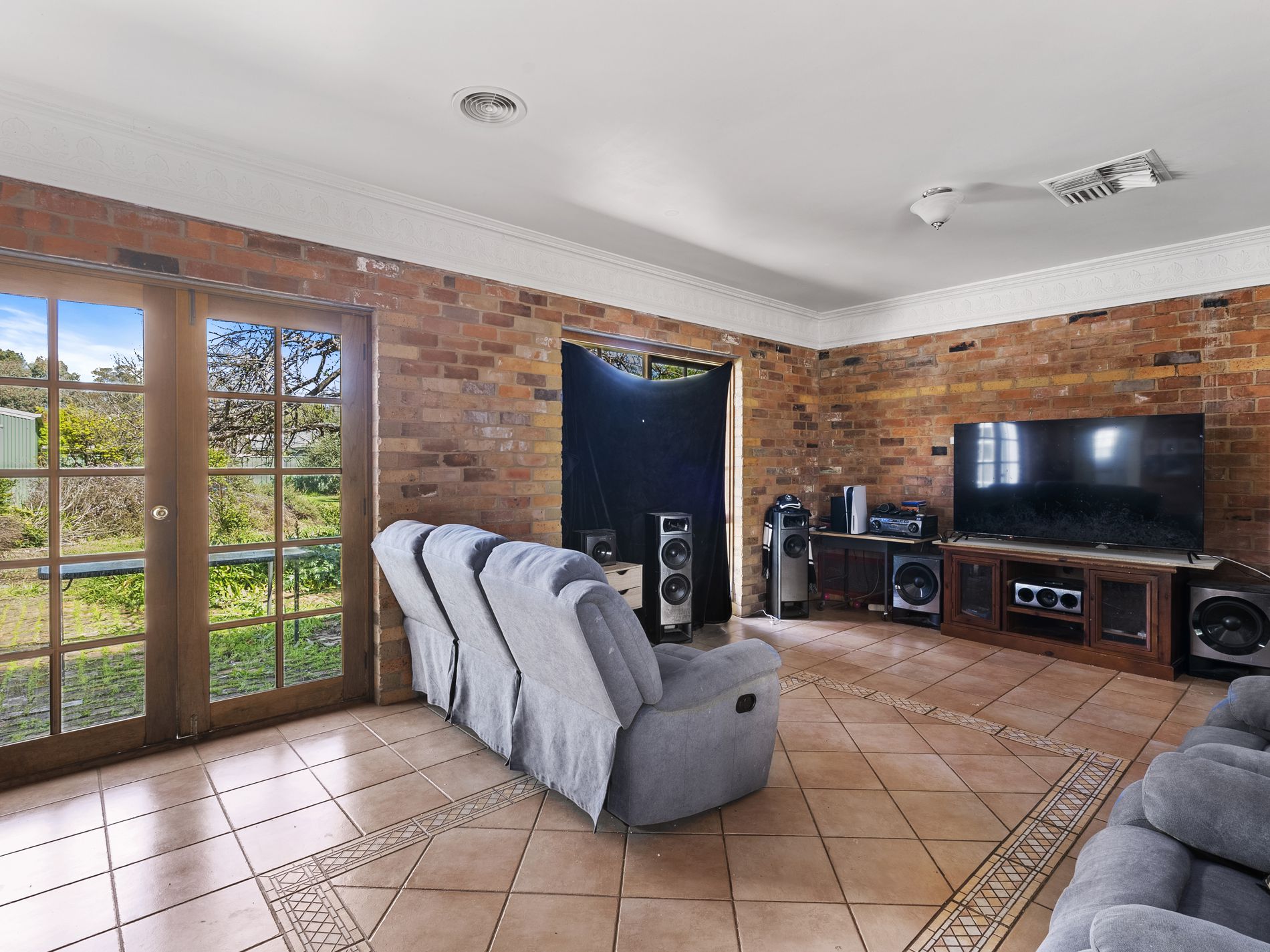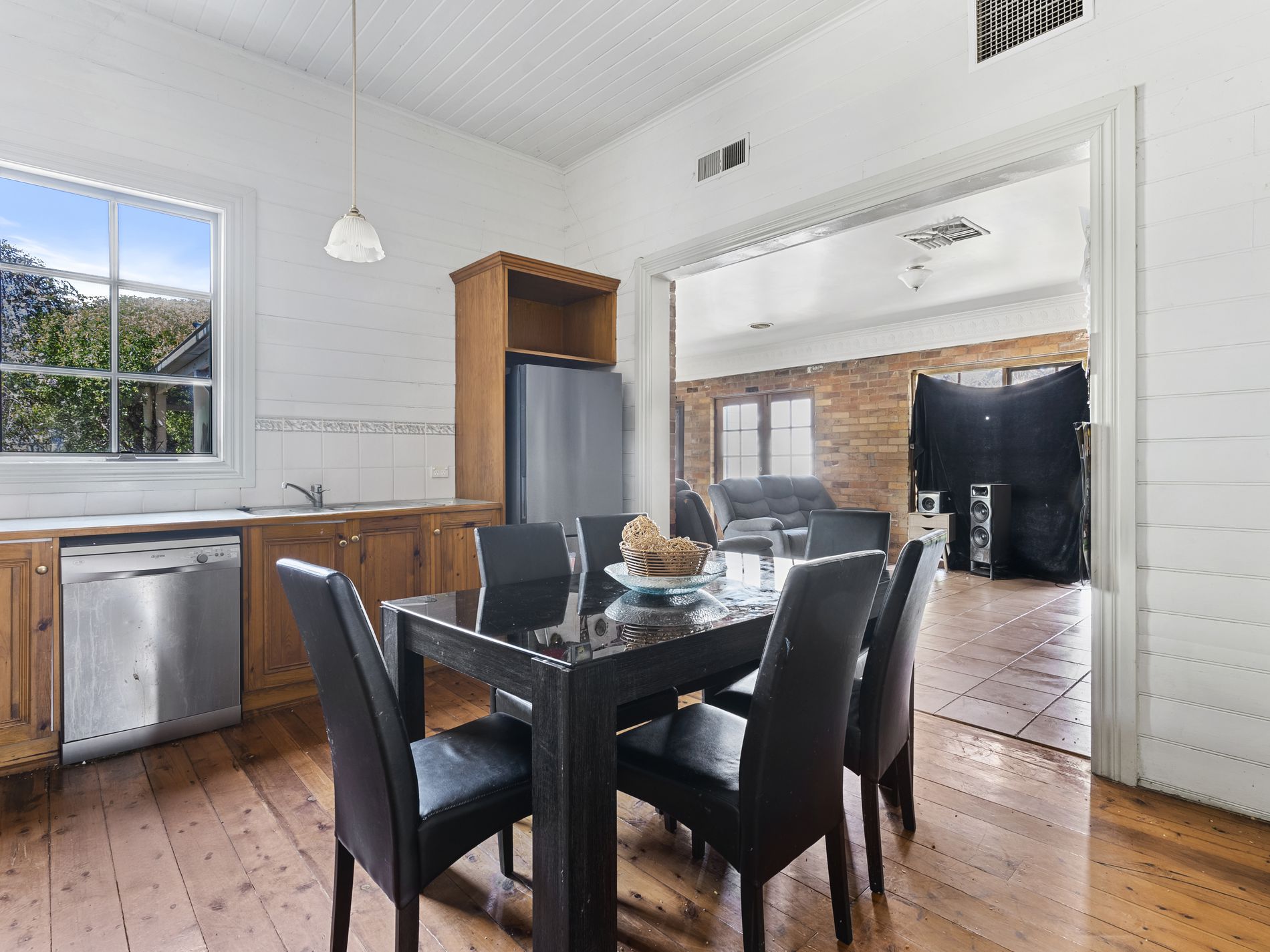 At the heart of the home, a generous kitchen and meals area offers timeless Blackwood timber cabinetry, a dishwasher, rangehood, and polished floorboards. This central hub flows seamlessly to a spacious second living area, enhanced by brick feature walls, tiled flooring, and elegant French doors that open to a paved cottage-style garden.
