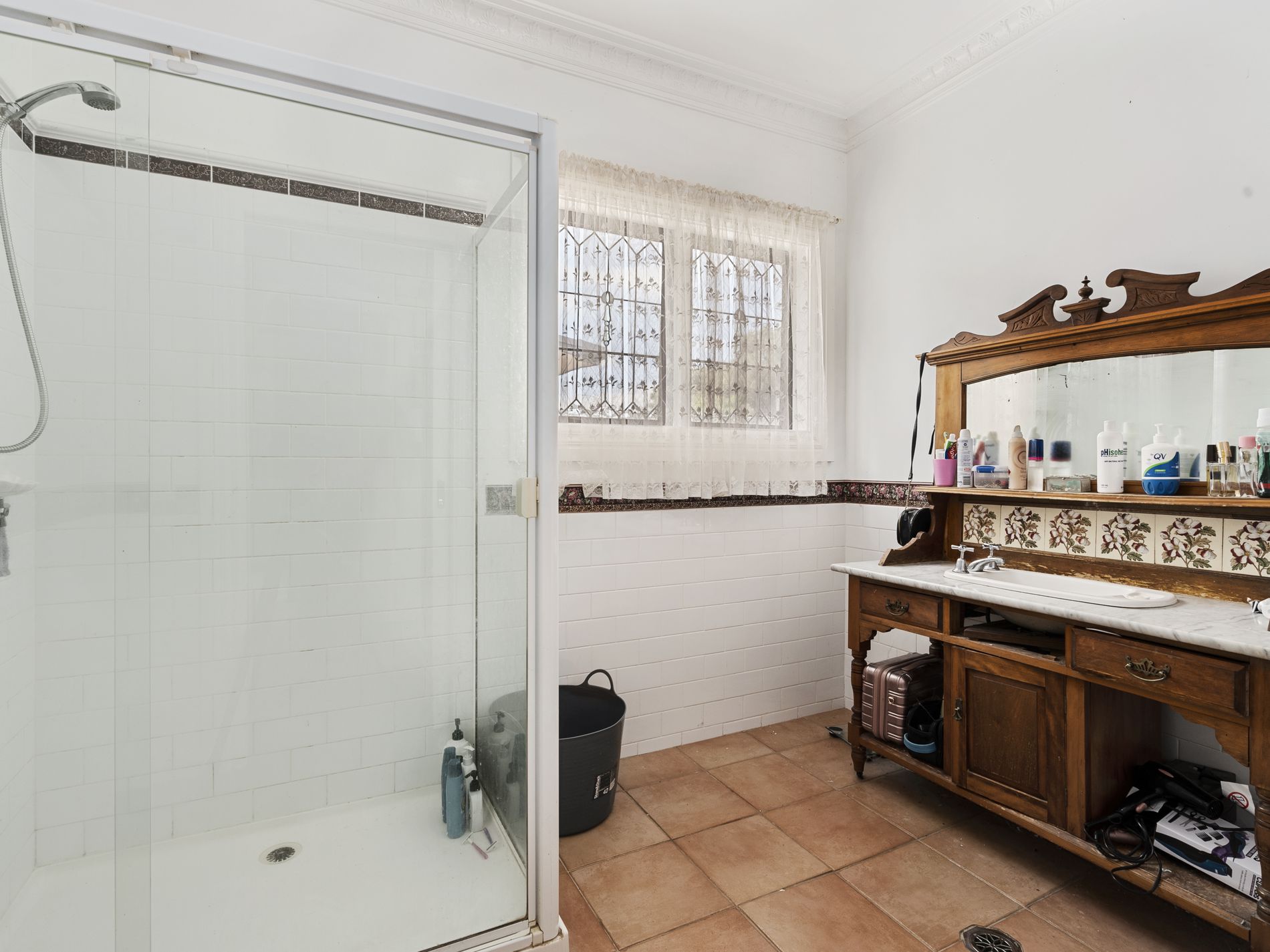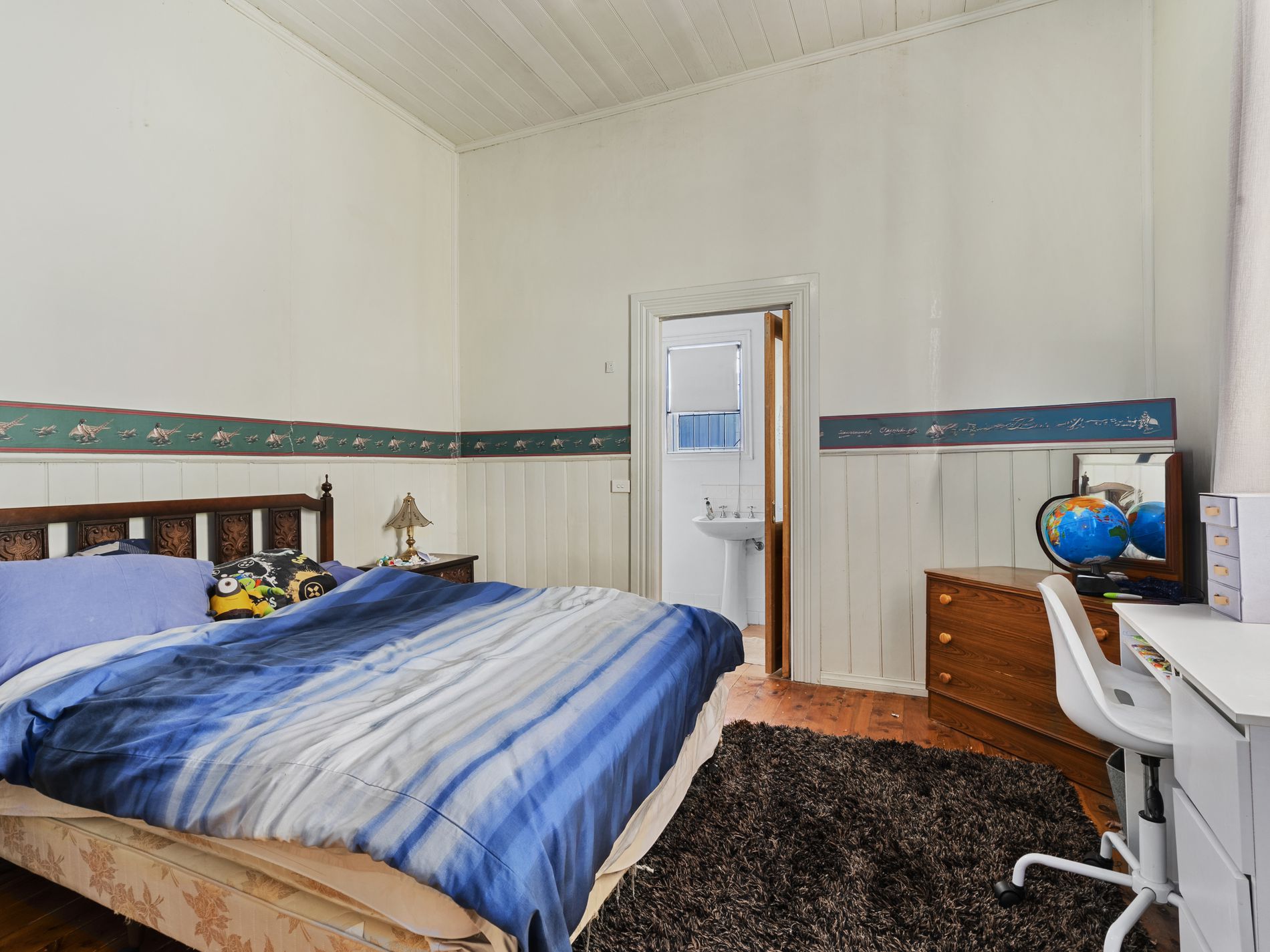 Three further bedrooms provide comfortable accommodation, two of which include built-in robes, high ceilings, quality carpets, and drapes. A central bathroom conveniently services these bedrooms, while additional storage solutions ensure practicality for everyday living.