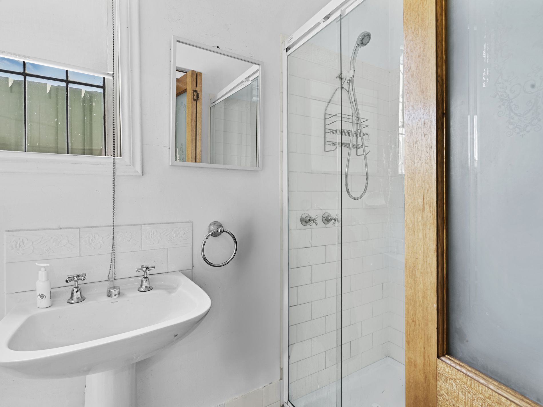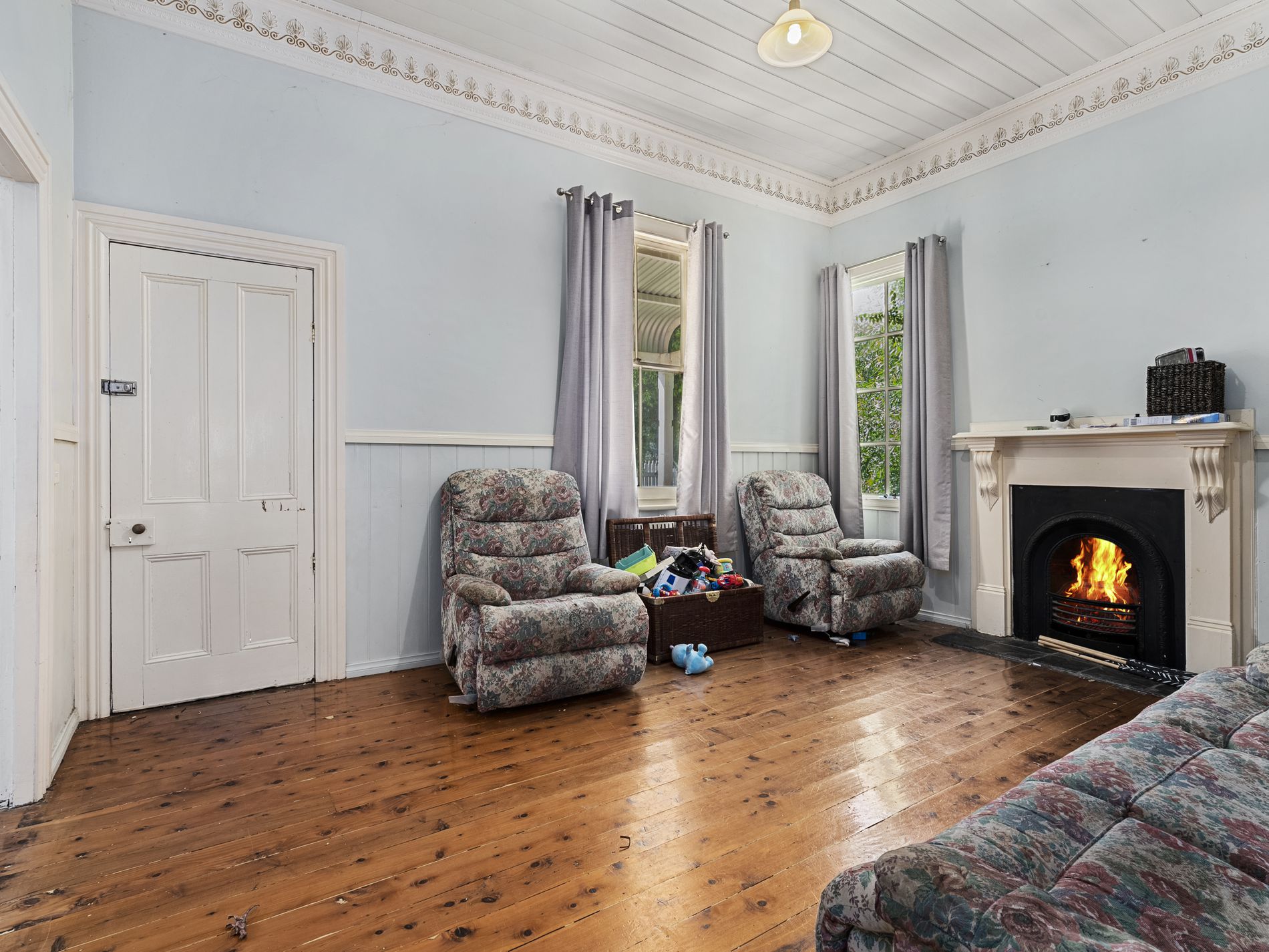 The first living area showcases beautiful period features, including timber-lined ceilings, an original fireplace with decorative mantle, and classic cornices and ceiling roses. Adjoining this space is a well-appointed bedroom complete with ensuite, featuring tiled shower, basin, and toilet.
