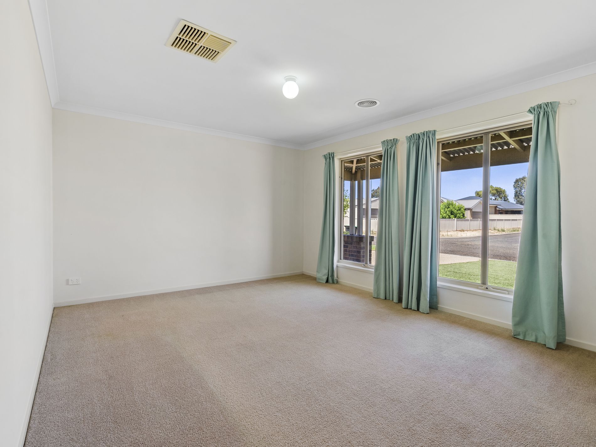 Tiled flooring flows through the hallways, kitchen, and main living area, while the second living area is carpeted and enjoys a large front window with curtains. The main living area is further enhanced with a split system, ensuring year-round comfort alongside the ducted heating and cooling throughout the home.