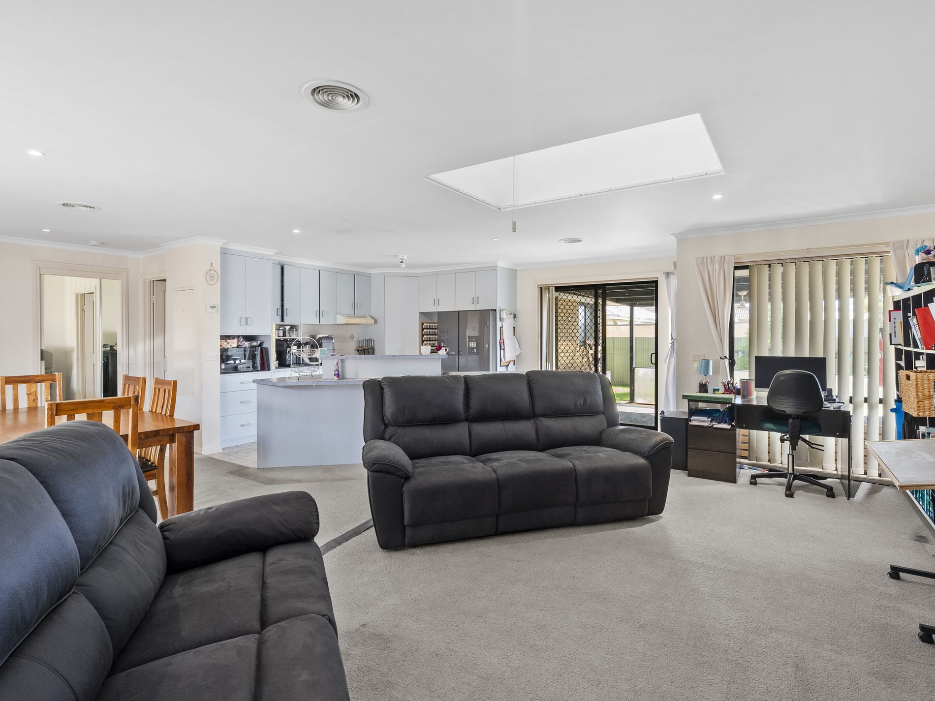The home features a spacious and functional kitchen, complete with ample bench space, generous storage, a pantry, gas cooktop, electric under-bench oven, separate grill, and the added convenience of a dishwasher. Overlooking the open plan living and dining area, this space is ideal for both everyday living and entertaining.